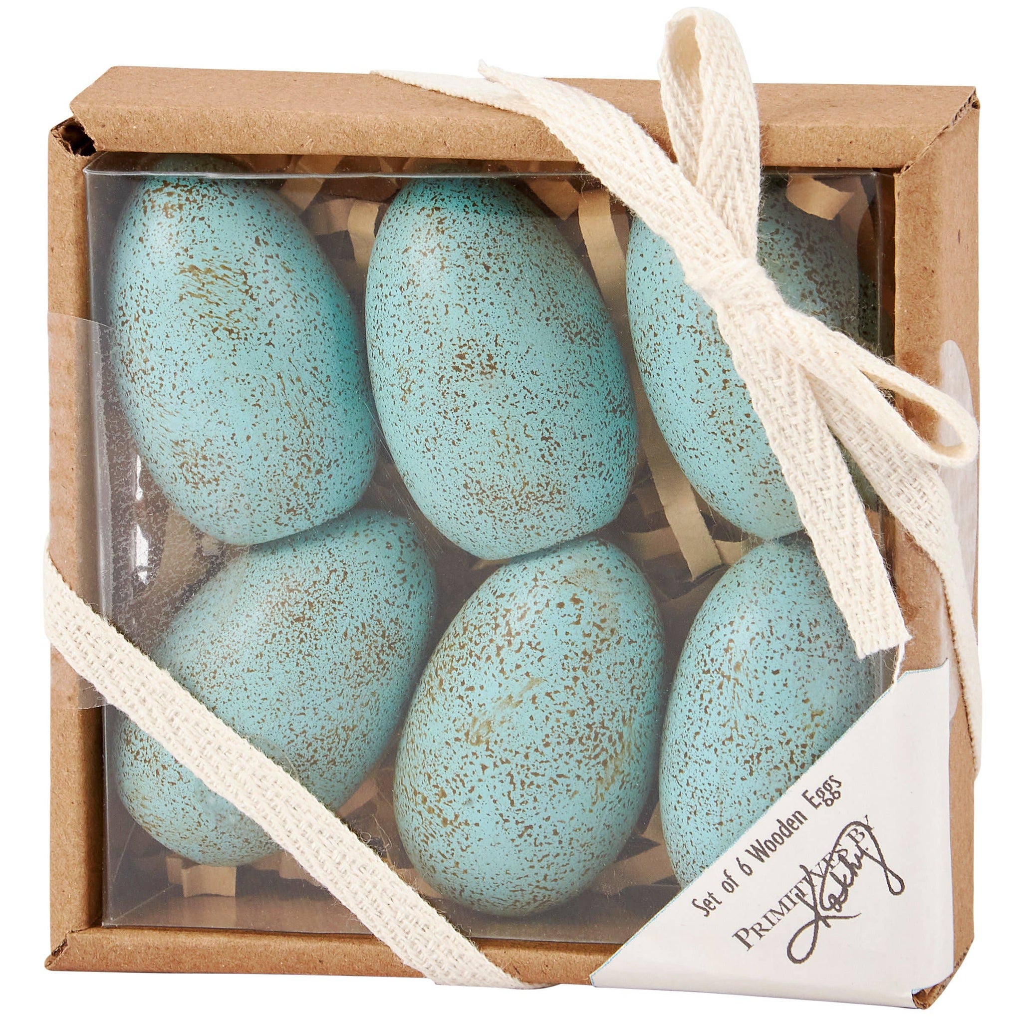 A set of six decorative wooden eggs from our Easter & Spring Collection displaying a blue robin's egg inspired design. Our Robin Blue wooden eggs come packaged in a cardboard box with acrylic lid and cotton tape ribbon around corners. A charming set of spring inspired home accents perfect for seasonal displays.